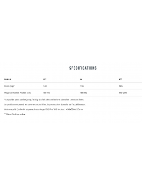 Le conteneur de parachute de secours est idéalement positionné pour un accès rapide et facile et les brides du secours sont reliées aux épaules.