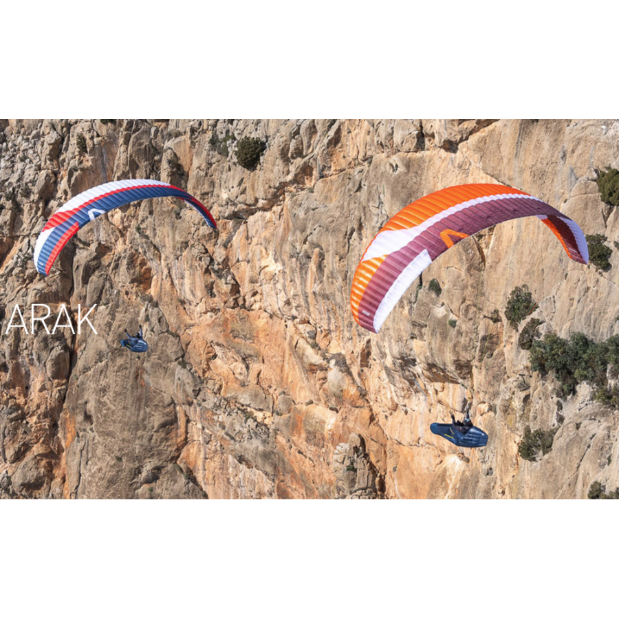 Par rapport à sa prédécesseure, l’ARAK2 a considérablement gagné en performance grâce à une nouvelle conception et des techniques de fabrication améliorées, tout en restant toujours aussi facile, voire plus facile, à piloter. Grâce au SPEED CONTROL, la voile peut maintenant être dirigée en vol accélérée à l’aide des élévateurs arrière, ce qui permet un style de vol plus efficace. Le retour d’information direct de la voile permet non seulement de gagner en confiance, mais aussi de faciliter une communication précise entre le pilote et sa voile. L’ARAK2 permet plus que jamais de trouver la position optimale dans les thermiques, rendant les vols non seulement plus longs mais aussi plus agréables. Sa maniabilité directe et précise procure un niveau de plaisir en vol inégalé, tout en garantissant un haut niveau de sécurité.